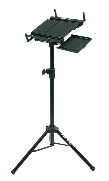 Free Standing Tripod Base Laptop Holder Can accommodate virtually any size laptop. Four stoppers, adjustable in width and depth, will securely anchor any size laptop, without interfering with input/output ports, expansion slots, cd-rw/dvd drivers, AC adapter sockets placed on either side of the laptop. The laptop tray is height and tilt adjustable and swivels 360 degrees to allow for ideal positioning of the laptop. Equipped with pull out mouse tray that can be positioned on either the right side or the left side of the laptop, and is retractable for easy storage and transport.